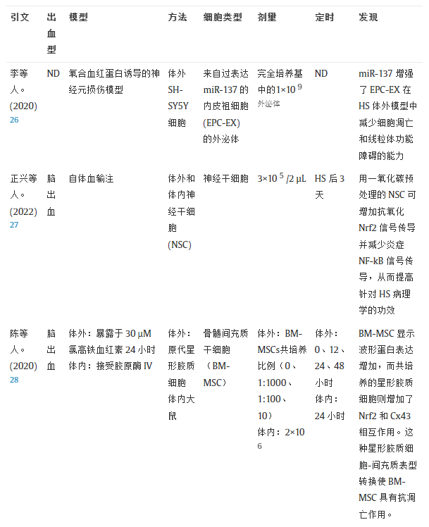 表1:該表舉例說明了有關使用干細胞治療出血性中風的研究。(ND=未描述)。
