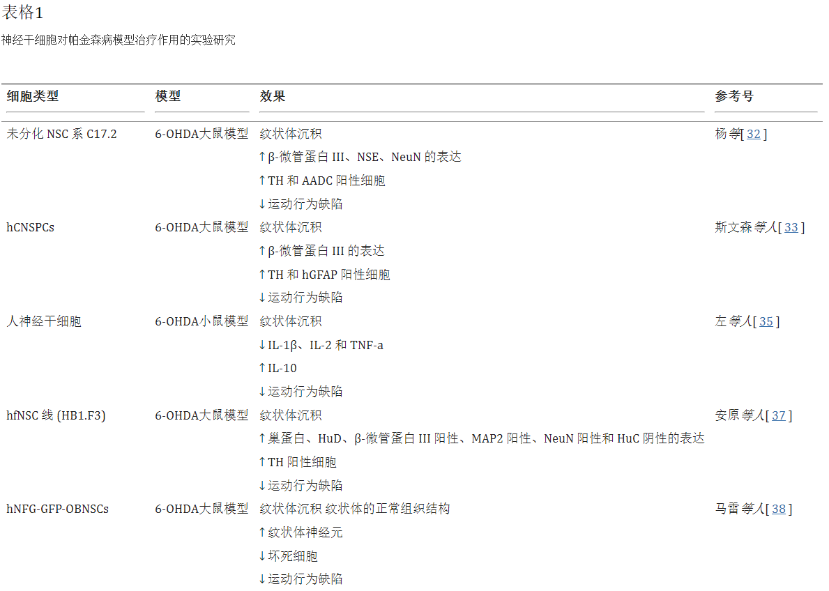 多項臨床前研究表明,不同類型的人類神經干細胞移植后,可以在特定的大腦部位遷移、存活和增殖。免疫組織化學檢查支持的證據表明移植的人類神經干細胞可以轉化為功能性神經元并整合到神經回路中。體內研究已證明神經干細胞移植是治療帕金森病的有效方法(表格1)。