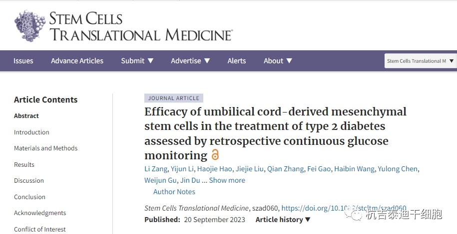 該篇文章發布在《干細胞轉化醫學》雜志上,數據結果表明顯示,通過靜脈輸注給予UC-MSC顯著增加TIR,并且具有較高AUCC-pep的男性患者更有可能從UC-MSC治療中受益。UC-MSCs移植可能是中國成人T2DM的一種潛在治療方法。
