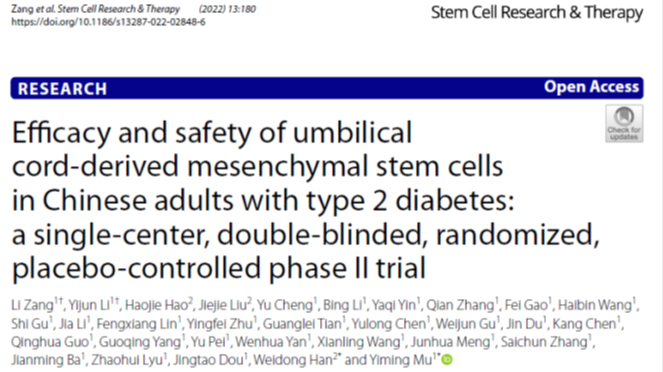 2022年5月3日,由中國人民解放軍第一醫學中心(原301醫院)內分泌科母義明教授和生物治療中心韓衛東教授領銜的一項單中心、隨機、雙盲對照間充質干細胞治療2型糖尿病II期臨床研究結果公布,發表在《Stem Cells Research&Therapy》雜志上。