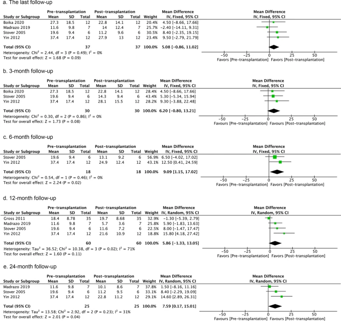 薈萃分析顯示,治療后與治療前相比,總體功能更好,但異質性也很明顯。在最后一次隨訪以及3、6、12和24個月的隨訪中,同種細胞療法對 “關閉 “狀態下的UPDRS評分產生了有益的影響,但在≥36個月的隨訪中沒有這種影響(圖2)。然而,只有兩項研究報告了后者(圖2)。在3個月、6個月和≥36個月的隨訪分析中,”關閉 “狀態下的UPDRS評分顯示出相對的同質性(圖2)。此外,細胞治療改善了12個月隨訪時 “開啟 “狀態下的UPDRS評分,但沒有改善最后一次隨訪或24個月、≥36個月隨訪時的評分(附加文件2:圖S2)。在12個月、24個月、≥36個月的隨訪中沒有明顯的異質性,但在最后一次隨訪中卻有明顯的異質性。這可能是由于不同的移植范例造成的。