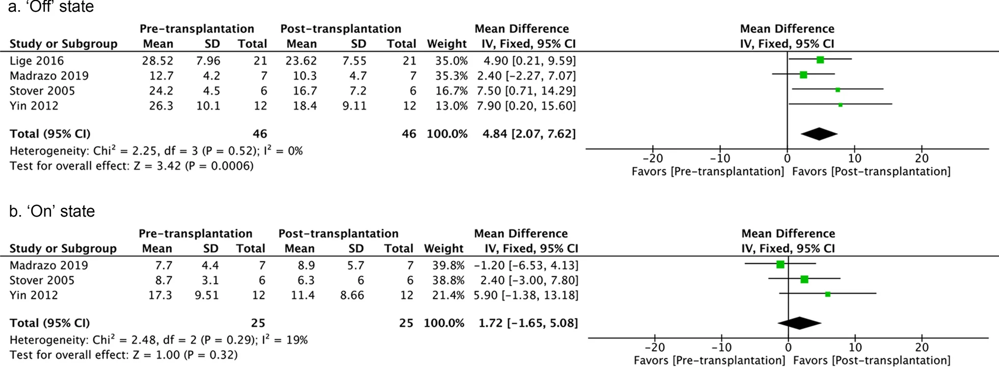 七項研究測量了干細胞療法對運動癥狀的影響。使用隨機效應模型來比較研究最后一次隨訪時“關閉”狀態下治療前與治療后的UPDRSIII評分。細胞處理后薈萃分析得到了更好的結果,但異質性很高(圖3)。