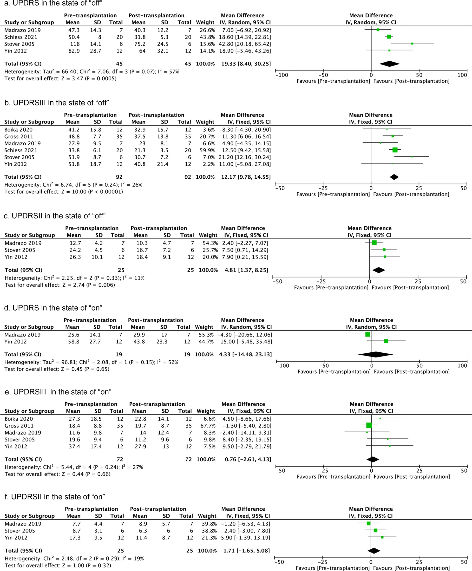 使用UPDRSII或Schwab和England評分評估ADL。四項研究檢查了最后一次隨訪時處于“關閉”狀態的UPDRSII評分。固定效應模型顯示同質細胞治療后有更好的結果。三項研究評估了“開啟”狀態下的 UPDRSII 評分(全部使用同種異體細胞),但沒有報告治療效果。沒有明顯的異質性(圖5)。
