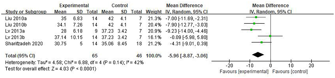 從圖4的森林圖可以看出,異質(zhì)性檢驗(yàn)p=0.14;I2=42%,表明中度異質(zhì)性。數(shù)據(jù)顯示,干細(xì)胞組的CARS評(píng)分顯著低于對(duì)照組[WMD:-5.96;95%CI(-8.87,-3.06);p<0.0001](圖4)。CARS得分越高表示疾病嚴(yán)重。