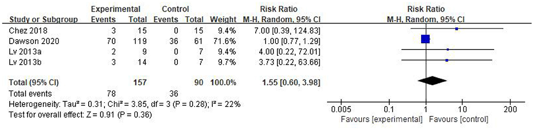 圖6中的森林圖反映了各組不良反應(yīng)的發(fā)生事件[RR=1.55;95%CI = (0.60, 3.98); p=0.36; 圖6],干細(xì)胞組與對(duì)照組的不良反應(yīng)發(fā)生率無顯著差異,異質(zhì)性檢驗(yàn)p=0.28;我2=22%。基于森林地圖,我們有視覺異常值。敏感性分析發(fā)現(xiàn),道森等人的研究是一個(gè)異常值,是異質(zhì)性的原因。而排除Dawson等人的研究后,結(jié)果更穩(wěn)定 [RR=4.70;95%CI= (0.90, 24.63); p=0.07;異質(zhì)性檢驗(yàn)p= 0.95; 我2=0%]。