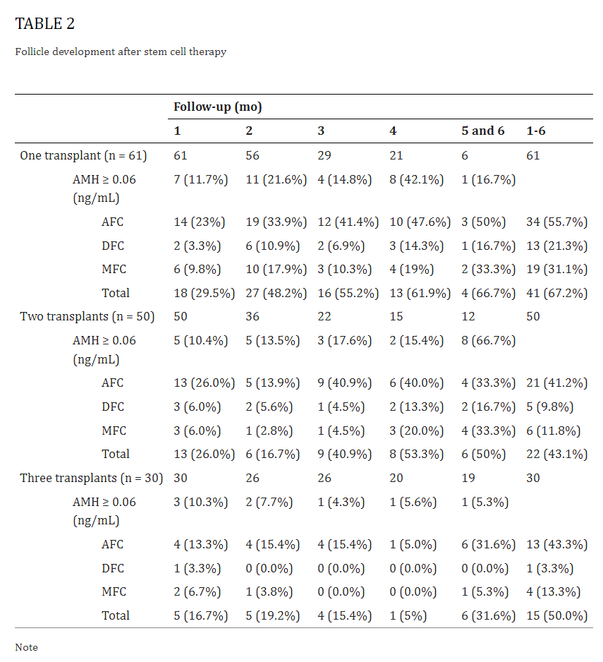 通過超聲引導(dǎo)下經(jīng)陰道注射將臍帶間充質(zhì)干細(xì)胞移植給患者,結(jié)果定義為干細(xì)胞治療后每月成熟卵母細(xì)胞的數(shù)量(表2)。所有患者均接受了第一輪手術(shù);但部分患者未能接受第二輪和第三輪移植,導(dǎo)致數(shù)例失訪。術(shù)后每月收集AMH、竇卵泡(AFC)、優(yōu)勢卵泡數(shù)(DFC)和成熟卵泡數(shù)(MFC)的數(shù)據(jù)。特別是,我們只能在第一次移植五個(gè)月后獲得六名患者的結(jié)果;因此,我們將第5個(gè)月和第6個(gè)月的數(shù)據(jù)整合到一個(gè)項(xiàng)目中以更加直觀。