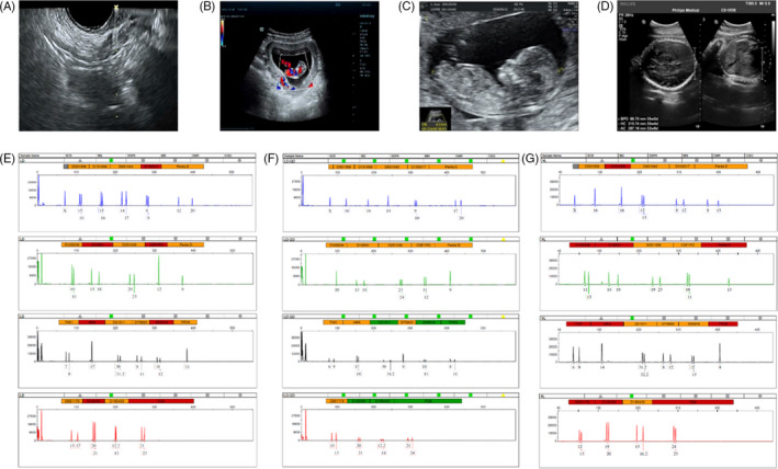 收集了15名接受取卵的患者的基本特征,包括取卵周期、胚胎移植和妊娠次數(shù)。一般來說,四個(gè)胎兒沒有出生缺陷,三個(gè)胚胎來自ICSI的受精類型,而最后一個(gè)是自然受孕的。1例術(shù)中超聲掃描顯示,在經(jīng)陰道超聲(TVUS)引導(dǎo)下,卵巢未見間質(zhì)增生或其他異常卵巢結(jié)構(gòu)(圖2A)。這名婦女在體外受精后成功懷孕,并在第8周進(jìn)行了基本產(chǎn)前程序的超聲掃描(圖2B),第13周(圖2C) 和第32周 (圖二維) 顯示正常的胎兒發(fā)育。微衛(wèi)星位點(diǎn)分析顯示,胎兒(圖2F)與母親有遺傳關(guān)系(圖2E) 供體UCMSC以外的其他人(圖2G)。