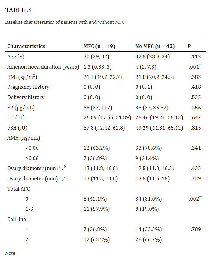 為了確認(rèn)治療效果與治療之前之間的關(guān)系,我們比較了19名在UCMSC注射后獲得成熟卵泡的患者和其他 42名未發(fā)育成熟卵泡的患者的基本臨床特征。MFC患者的中位年齡為30歲,閉經(jīng)持續(xù)時(shí)間為1.3年。這些MFC患者的E2血激素水平有高于無MFC組的趨勢,兩組之間LH和FSH水平?jīng)]有差異。作為卵巢儲備的有效指標(biāo),還測試了AMH水平。總體而言,MFC組36.8%的AMH水平≥0.06ng/mL,而無MFC組的比例為 21.4%。