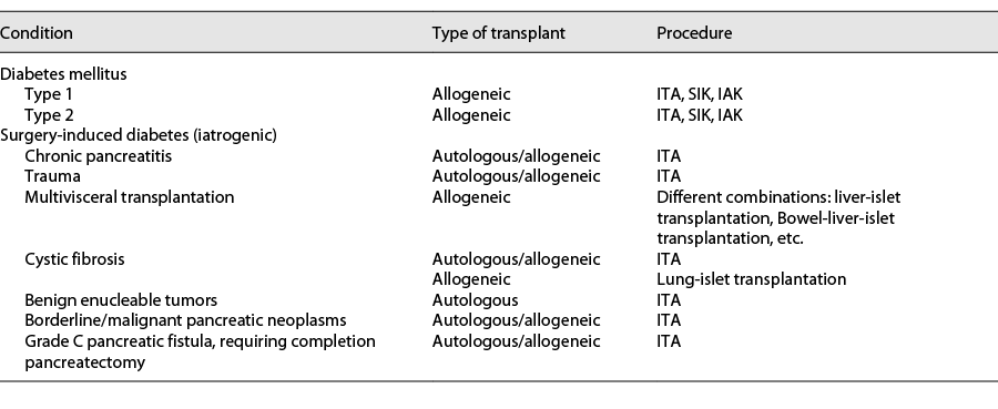 如今,胰島移植可被視為與β細胞功能喪失相關的多種病癥的一種治療選擇(表1)。該程序可以作為單獨胰島移植 (ITA) 在非尿毒癥受試者中進行,這是一種通常用于治療醫源性(手術引起的)糖尿病和1型糖尿病的非尿毒癥患者的選擇。