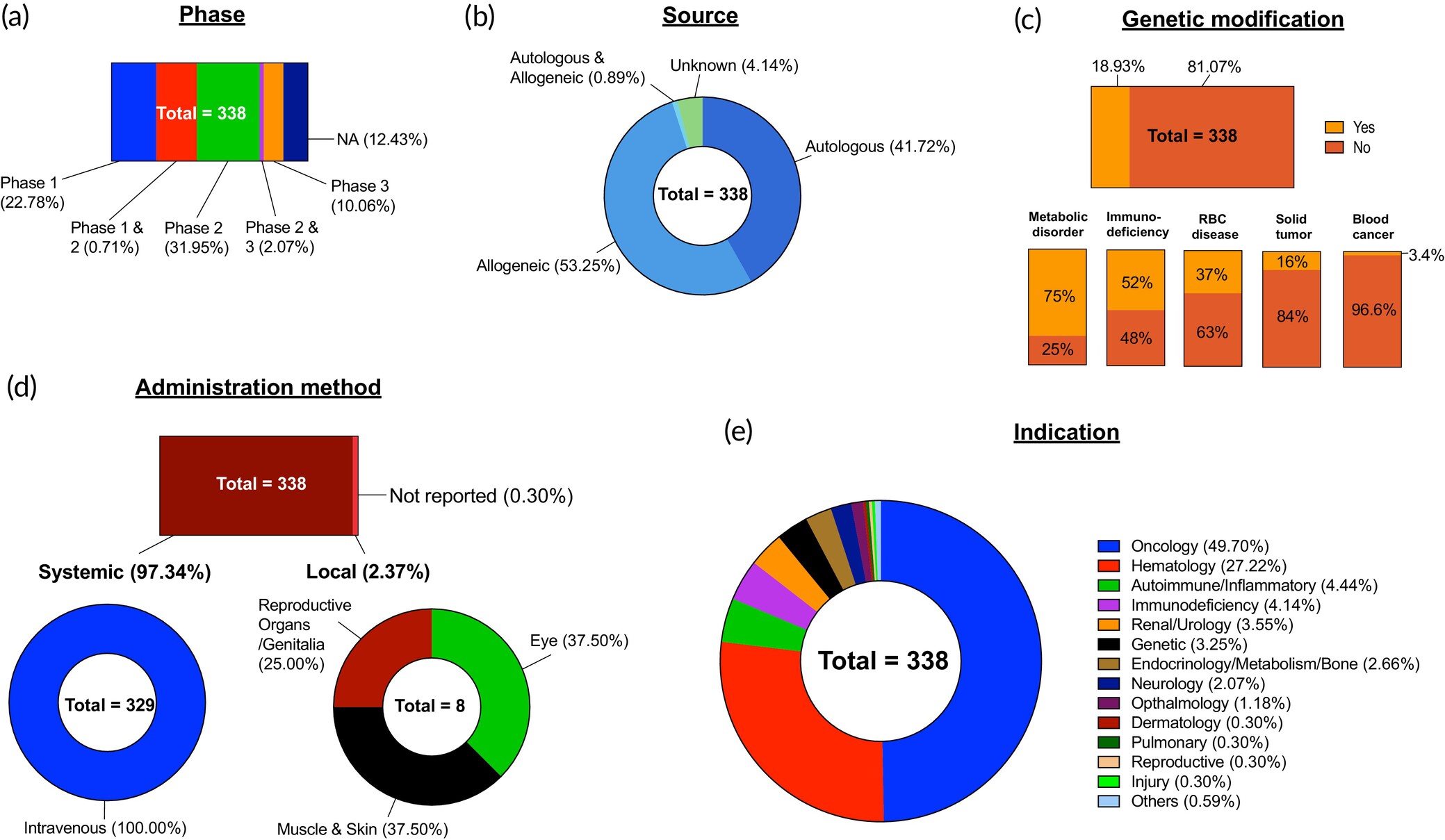 對346項MSC臨床試驗進行了分析,并根據(jù)以下標準進行了分類:(a) 試驗階段;(b) 細胞來源;(c) 給藥方法,進一步分為全身和局部途徑;(d) 適應癥類型。不適用 (NA)。