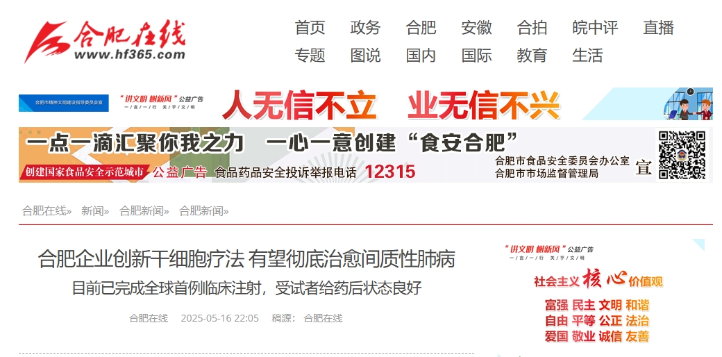 2025年5月,據(jù)合肥晚報(bào)、澎湃新聞等多家權(quán)威媒體報(bào)道,上海市第六人民醫(yī)院呼吸與危重癥醫(yī)學(xué)科任濤教授團(tuán)隊(duì),成功完成了全球首款“誘導(dǎo)多能干細(xì)胞(iPSC)衍生的基因修飾間充質(zhì)干細(xì)胞注射液”用于治療間質(zhì)性肺病患者的臨床輸注。