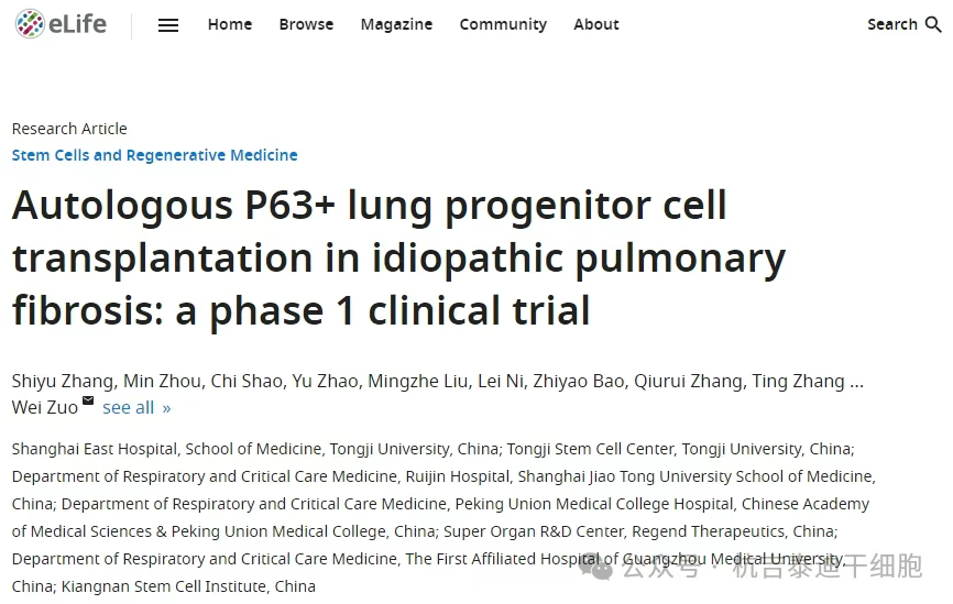 2025年3月,以中國(guó)同濟(jì)大學(xué)醫(yī)學(xué)院上海市東方醫(yī)院(以下簡(jiǎn)稱(chēng)我們)為牽頭的機(jī)構(gòu)進(jìn)行了一項(xiàng)自體P63+肺祖細(xì)胞移植治療特發(fā)性肺纖維化:1期臨床試驗(yàn)。該臨床試驗(yàn)結(jié)果發(fā)表在期刊雜志《Stem Cells and Regenerative Medicine》上。