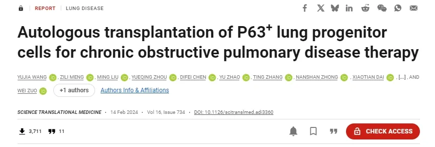 [4]Yujia Wang et al.,Autologous transplantation of P63+ lung progenitor cells for chronic obstructive pulmonary disease therapy.Sci. Transl. Med.16,eadi3360(2024).DOI:10.1126/scitranslmed.adi3360