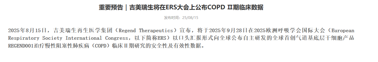 8月15日,上海瑞金落地的慢阻肺干細胞治療臨床實驗室吉美瑞生再生醫(yī)學(xué)集團(Regend Therapeutics)正式宣布,將在2025年9月28日于荷蘭阿姆斯特丹舉辦的歐洲呼吸學(xué)會國際大會(ERS)上,以口頭匯報形式向全球披露其自主研發(fā)的全球首創(chuàng)氣道基底層干細胞產(chǎn)品REGEND001,在治療慢性阻塞性肺疾?。–OPD)臨床Ⅱ期研究中的安全性與有效性核心數(shù)據(jù),為全球慢阻肺病治療領(lǐng)域帶來新的關(guān)注焦點。[9]