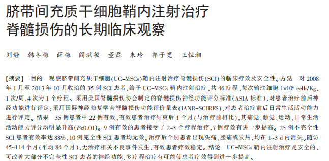 2018年,空軍總醫院與北京放射與輻射醫學研究所公布了臍帶間充質干細胞鞘內注射治療脊髓損傷的長期臨床觀察結果。22例有效SCI患者接受臍帶間充質鞘內注射治療,結果表明UC-MSCs鞘內注射治療是安全的,可改善大部分不完全性SCI患者的神經功能,多療程治療有可能使患者療效得到進一步提高。