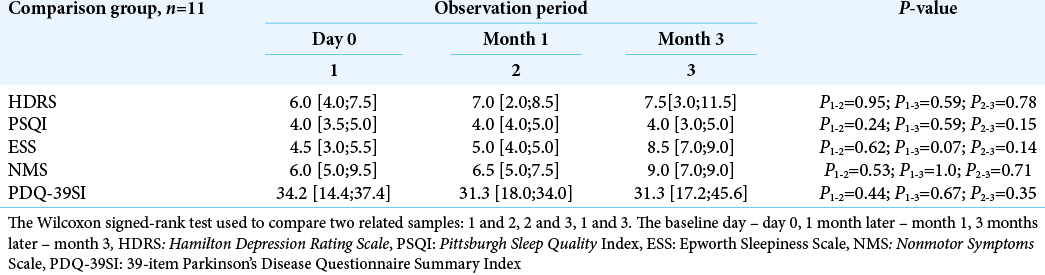 治療的有效性也通過NMS量表進行評估。第0天 (Me=8.0 [6.0; 13.5]) 和第3個月 (Me=7.0 [6.0; 10.5]) 之間 PD非運動表現總數有減少的趨勢 [表格1] 也被揭曉。相比之下,對照組患者在同一觀察期間表現出癥狀加重的趨勢[表3]。