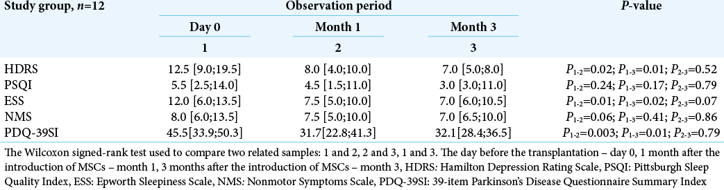 我們發現治療前的MDSUPDRS評分(第III部分)(Me=36.5[30.0; 57.5])與治療后第1個月的評分(Me =33.5[26.0; 52.5])之間存在統計學顯著差異(P=0.02 )。在學習小組期間。差異達9%。移植后所取得的結果維持3個月(Me=32.0 [23.0; 40.0])。在治療期間,治療前評分 (Me=20.0 [15.5; 34.0]) 和第1個月 (Me = 22.0 [14.5; 31.0])、( P=0.18) 以及第1個月和第1個月之間的評分差異有統計學意義3(Me=19.0 [15.0; 31.0],[ P=0.2])未檢測到。