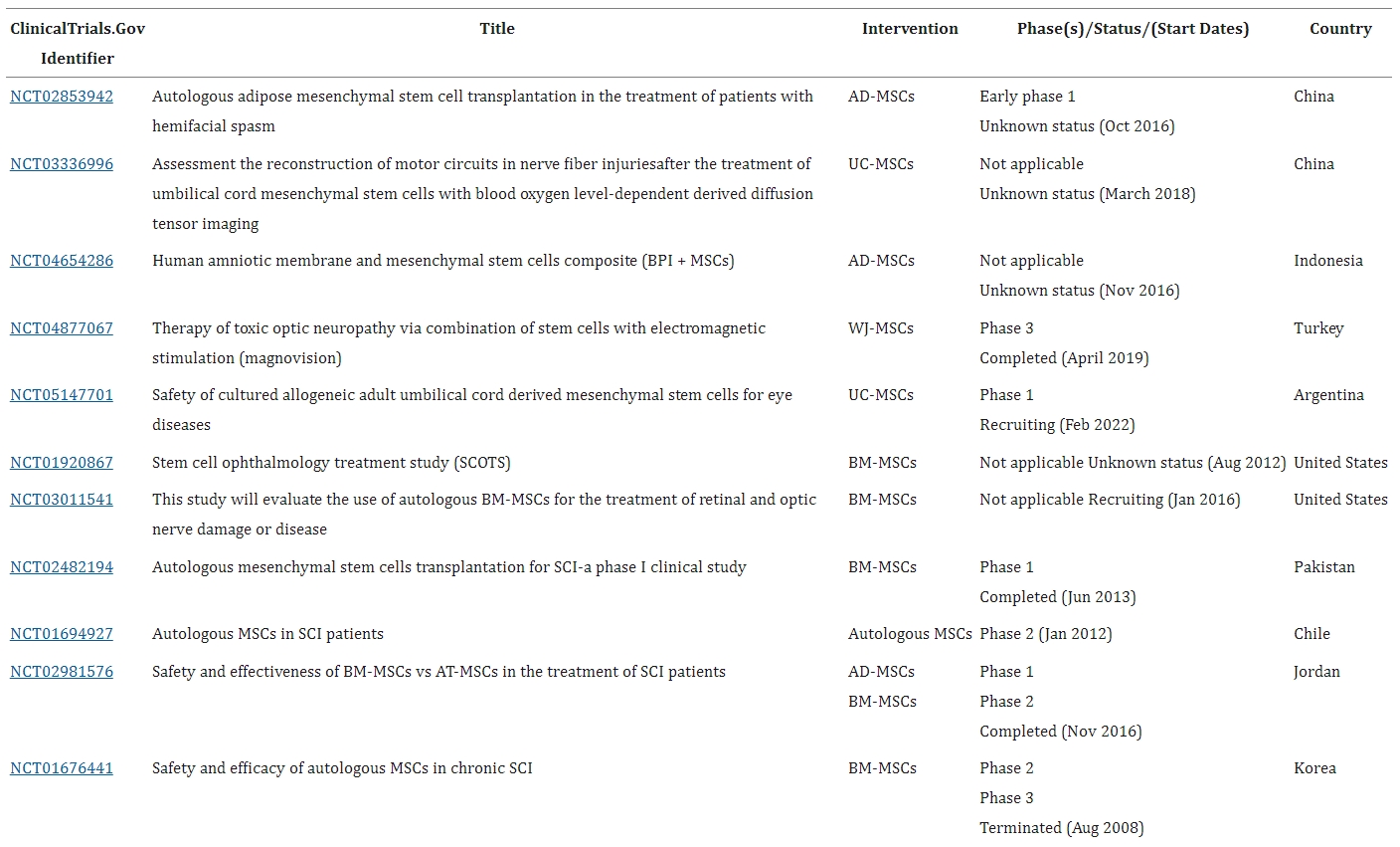 截至今天(2024年12月23日),公共臨床試驗(yàn)數(shù)據(jù)庫(kù) ( ClinicalTrials.gov ) 中已注冊(cè)7項(xiàng)使用間充質(zhì)干細(xì)胞治療神經(jīng)損傷的試驗(yàn)和32項(xiàng)使用間充質(zhì)干細(xì)胞治療脊髓損傷的試驗(yàn)(表2)。