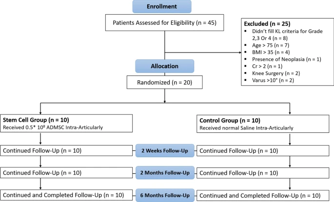 方法:這項三盲介入性臨床試驗納入了20例符合美國風濕病學會 (ACR) 標準的特發(fā)性膝關節(jié)骨關節(jié)炎 (OA) 患者。患者被隨機分配接受關節(jié)內(nèi)注射0.5×108個同種異體ADMSC或生理鹽水(對照組)。