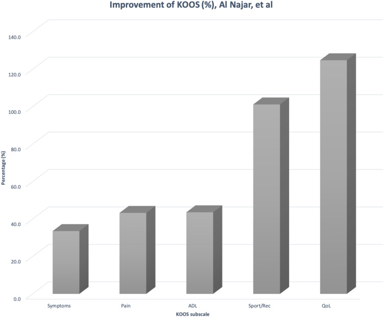 圖1:間充質(zhì)干細(xì)胞后干預(yù)(30.5×106個自體BM-MSC和雙劑量)的KOOS量表改進(jìn)百分比