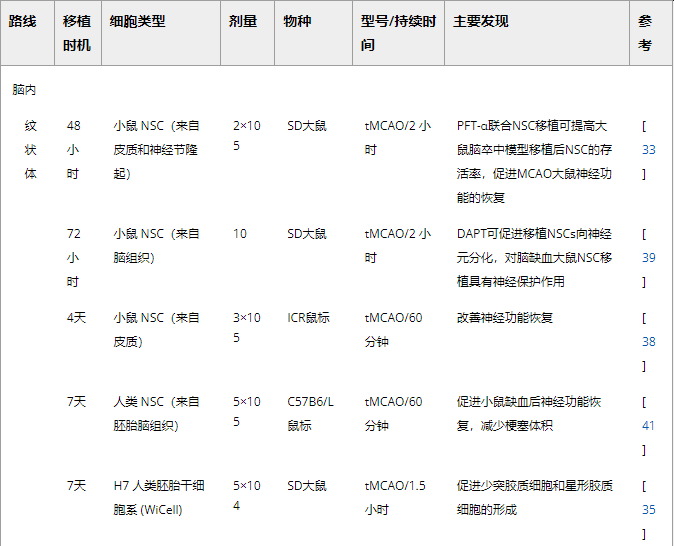 表2:腦內(心室和紋狀體)NSC移植治療腦缺血的代表性實驗研究。