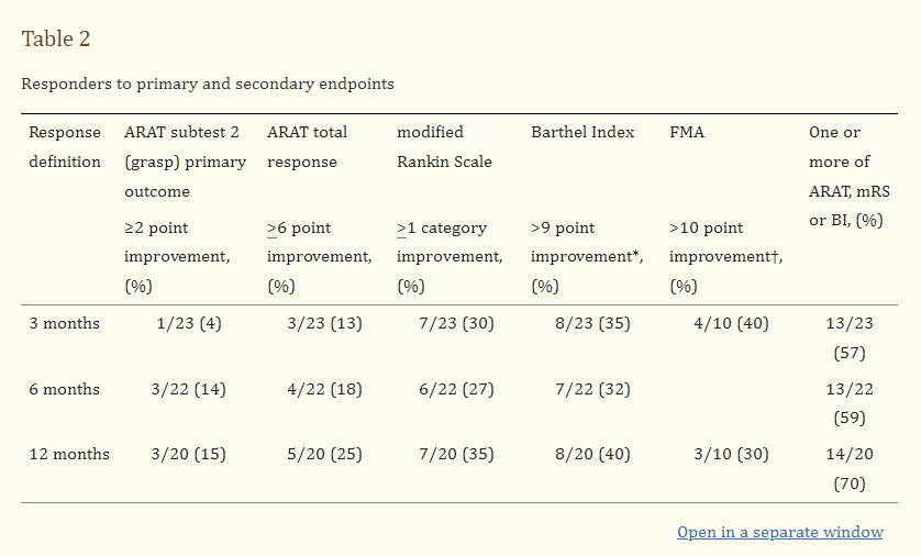 次要結(jié)果:7/23名患者在最后一次觀察時(shí)總ARAT評(píng)分有所改善,個(gè)體改善范圍在1到54分之間。五名 (22%) 患者達(dá)到改善≥6分的反應(yīng)標(biāo)準(zhǔn)。沒(méi)有參與者表現(xiàn)出統(tǒng)計(jì)分析計(jì)劃中定義的 NIHSS總分發(fā)生10分或更多分的變化,因此從中省略了這一點(diǎn)表2; 然而,只有四名參與者的基線NIHSS>10。在12個(gè)月時(shí),8/20名參與者的Barthel指數(shù)變化≥9分,但無(wú)法在基線得分為95或100(上限)的6名受試者中進(jìn)行評(píng)估。僅對(duì)10名參與者進(jìn)行了Fugl-Meyer 運(yùn)動(dòng)評(píng)分,其中3名參與者改善了≥10分。在12個(gè)月時(shí),7/20名參與者的mRS改善了≥1級(jí)(詳情見(jiàn)表2)。