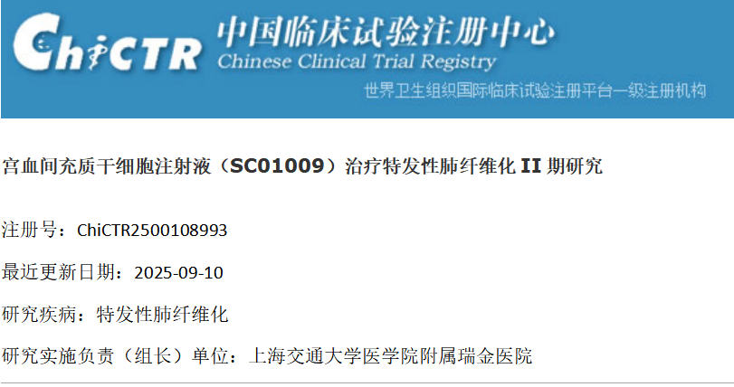 今年9月10日,中國臨床試驗注冊中心公布了一項具有重要意義的新動態(tài):由上海交通大學(xué)醫(yī)學(xué)院附屬瑞金醫(yī)院主導(dǎo)的“宮血間充質(zhì)干細胞注射液(SC01009)”Ⅱ期臨床研究已正式啟動。