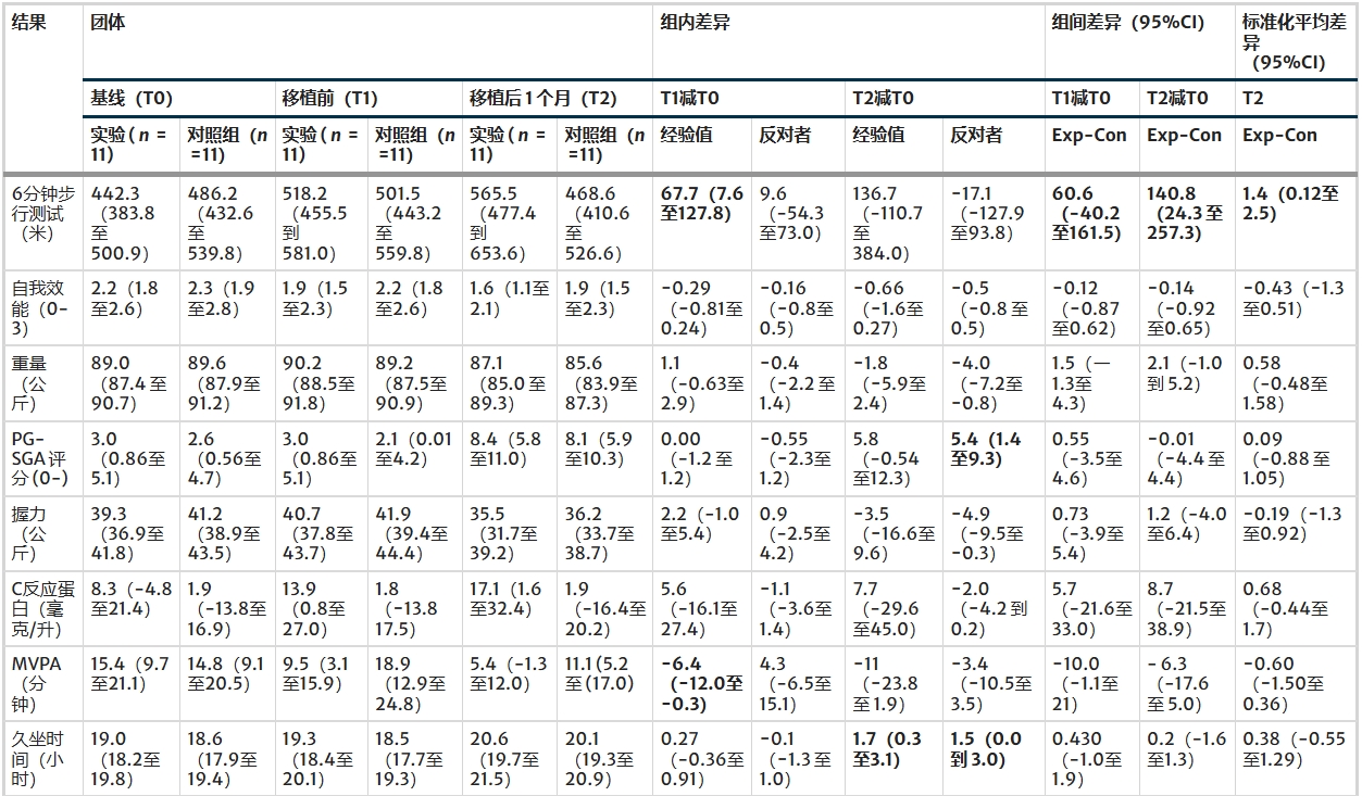 總結:研究顯示預康復安全性良好,僅出現輕微不良事件(如皮膚刺激、肌肉酸痛),自體干細胞移植后常見并發癥為腹瀉和發熱性中性粒細胞減少,5 例患者病情進展或復發。主要療效指標(6分鐘步行距離)表明,實驗組較對照組有顯著改善,效應量超過臨床意義閾值,提示干預措施對患者運動能力有積極影響。