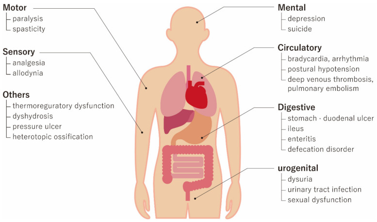 脊髓損傷(SCI)主要由交通事故、跌倒和運動相關損傷等嚴重外傷引起,全世界有超過 100 萬患者患有 SCI 相關癱瘓。隨著社會老齡化進程的加快,老年SCI患者因低能量跌倒而增多。SCI 不僅會導致運動功能缺陷,例如癱瘓,還會導致許多其他嚴重的醫療問題,包括呼吸系統、泌尿生殖系統和皮膚問題(圖1) 。除了嚴重的醫療問題外,SCI患者通常都很年輕,需要更長時間的醫療和社會護理,導致嚴重的社會經濟問題,不僅對患者及其護理人員,而且對社會也是如此。