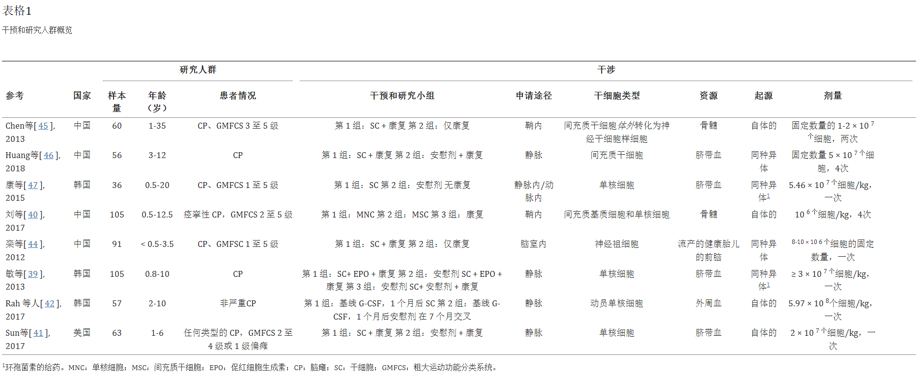包括的所有患者都被診斷為CP。CP的嚴重程度是用粗大運動功能分類系統來衡量的,它將CP的癥狀分為5個等級,其中5級是最嚴重的運動障礙。試驗中干細胞的類型和劑量不同。