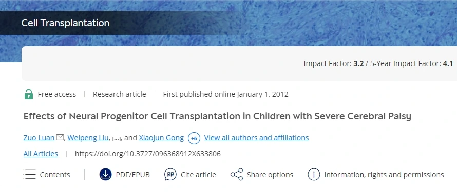 2012年,中國海軍總醫院在《細胞移植》發表的研究顯示,神經干細胞(NPC)移植對青少年重度腦癱兒童具有顯著療效與安全性。該研究納入45例重癥腦癱兒童平均年齡13歲以上,通過標準化手術移植神經干細胞,結果顯示:
