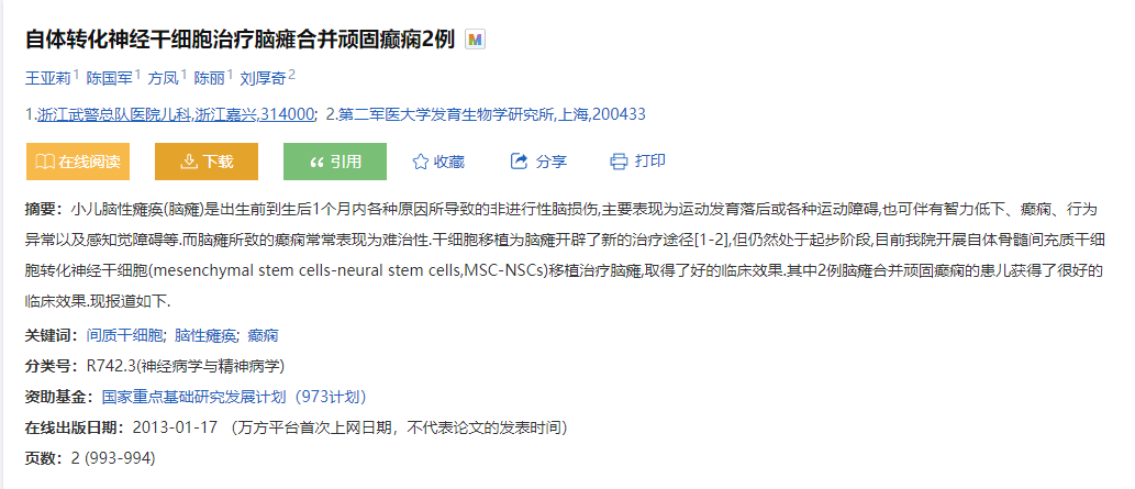[3]:王亞莉,陳國軍,方鳳,等. 自體轉化神經干細胞治療腦癱合并頑固癲癇2例[J]. 臨床薈萃,2012,27(11):993-994.