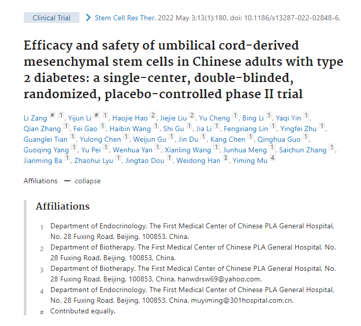 2022年5月,《Stem Cells Research & Therapy》期刊上公布了一項單中心、隨機、雙盲對照間充質(zhì)干細胞治療2型糖尿病二期臨床研究結(jié)果。該項研究由解放軍總醫(yī)院內(nèi)分泌科母義明教授、生物治療中心韓衛(wèi)東教授領(lǐng)銜。試驗結(jié)果表明,通過靜脈輸注給予UC-MSCs(臍帶間充質(zhì)干細胞)是一種安全有效的方法,可以減少外源性胰島素需求,緩解2型糖尿病患者的胰島素抵抗。臍帶間充質(zhì)干細胞移植是2型糖尿病的潛在治療選擇。