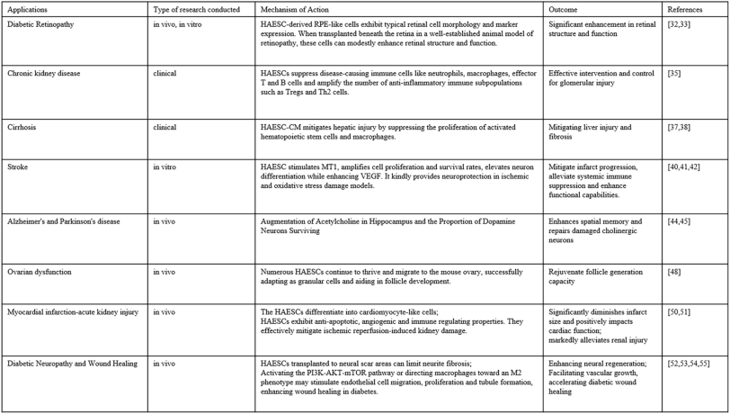 無論是hAESC衍生的細胞移植或用 hAESC 治療,還是hAESC釋放的分子,都可以改善高血糖和糖尿病進展等許多有害狀況。此外,hAESC還可顯著延緩糖尿病視網膜病變的進展,并改善慢性腎病、肝硬化、中風、帕金森病、卵巢功能障礙、心肌梗死-急性腎損傷、糖尿病神經病變和傷口愈合的功能恢復。