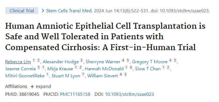2024年,《干細胞移植醫學》發表了一篇“人類羊膜上皮細胞移植對代償性肝硬化患者安全且耐受性良好:首次人體試驗”臨床研究的文章。