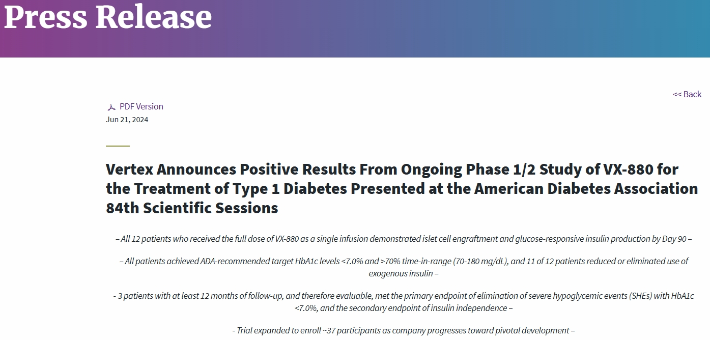 2024年6月,Vertex宣布正在進行的VX-880治療1型糖尿病的1/2期研究取得積極成果,并在美國糖尿病協(xié)會第84屆科學(xué)會議上發(fā)表。