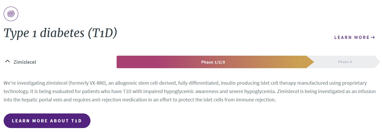 Zimislecel(原名VX-880)是Vertex公司在研的全分化胰島細(xì)胞療法,聯(lián)合標(biāo)準(zhǔn)免疫抑制療法,目前正處于一項(xiàng)針對伴有嚴(yán)重低血糖事件 (SHE) 和低血糖意識受損的1型糖尿病 (T1D) 患者的1/2/3期臨床研究的3期階段。這項(xiàng)關(guān)鍵性試驗(yàn)進(jìn)展順利,預(yù)計(jì)將于2025年上半年完成患者入組和給藥,并于2026年提交全球監(jiān)管機(jī)構(gòu)。