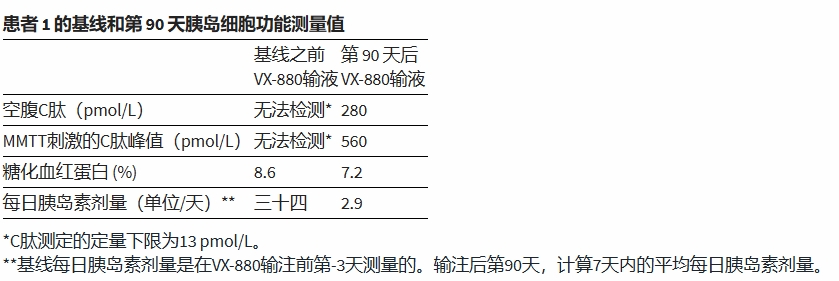 - 如前所述,概念驗(yàn)證已在前兩名接受VX-880目標(biāo)劑量一半治療的患者身上得到實(shí)現(xiàn),這些患者表現(xiàn)出對葡萄糖反應(yīng)性的胰島素分泌、糖化血紅蛋白 (HbA1c) 改善以及外源性胰島素減少;