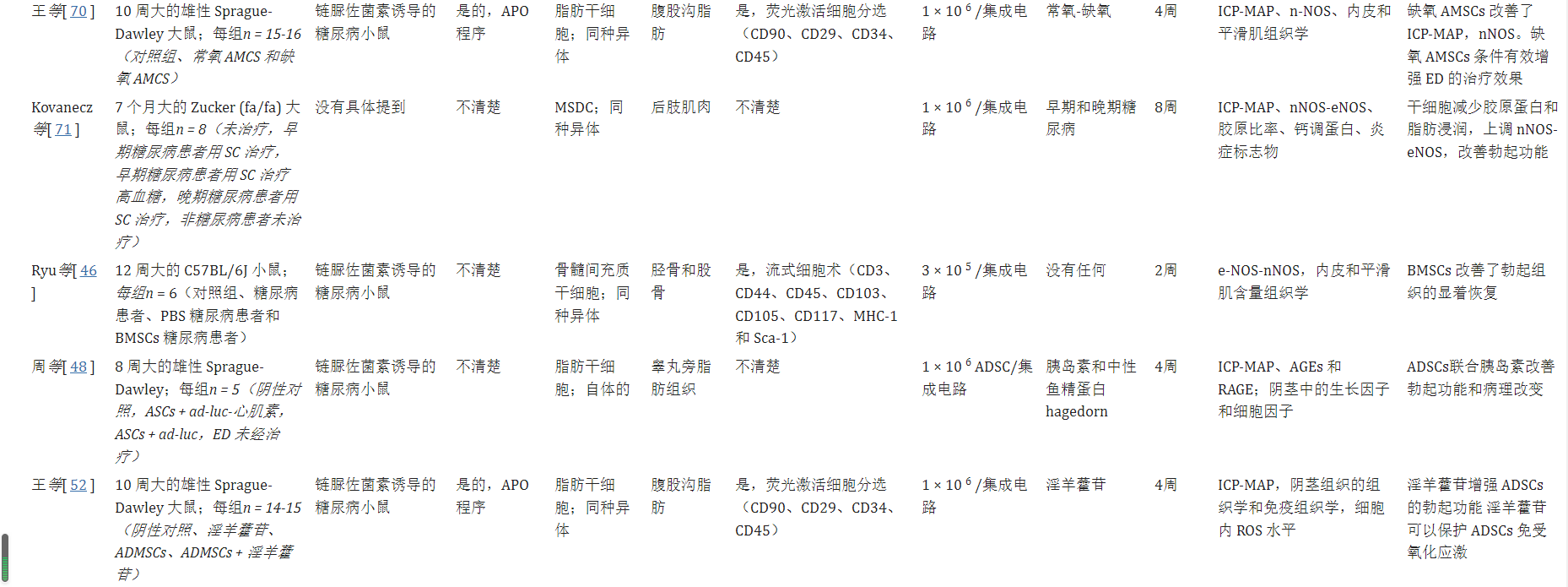 自2000年代以來,就一直在開展ED病例的干細胞研究。然而,大多數(shù)研究僅限于實驗動物。在本文回顧的 25項研究中,我們發(fā)現(xiàn)其中21項是在動物身上進行的(表1) 和四個關(guān)于人類的 (表2)。