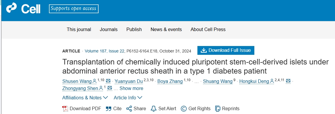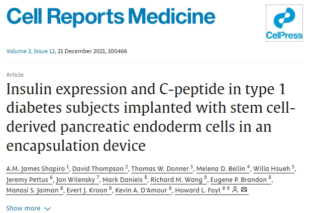 該試驗評估了在腹部前直肌鞘下自體移植化學誘導的多能干細胞來源的胰島 (CiPSC 胰島) 治療1型糖尿病的可行性。患者在移植后75天開始實現持續的胰島素依賴?;颊叩难沁_到目標范圍時間從基線值的43.18%增加到移植后第4個月的96.21%,同時糖化血紅蛋白 (長期全身血糖水平處于非糖尿病水平的指標) 下降。