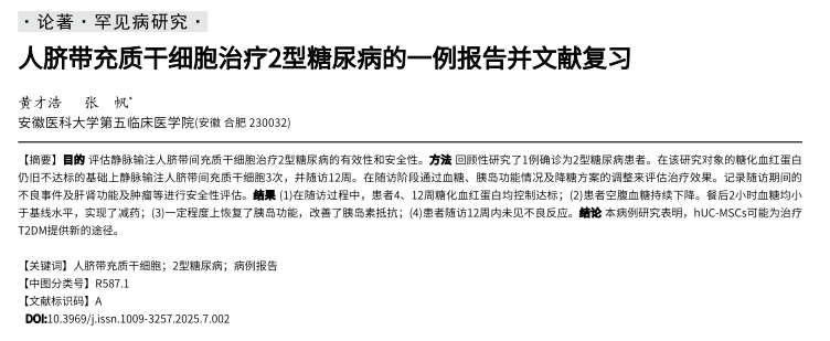2025年7月25日,安徽醫科大學第五臨床醫學院在《罕少疾病雜志》上發表了一篇題為《人臍帶充質干細胞治療2型糖尿病的一例報告并文獻復習》的研究報告,給廣大糖尿病患者帶了康復的新希望。[3]