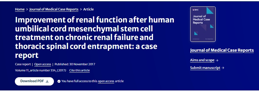 2017年,印度尼西亞大學在醫學期刊《Journal of Medical Case Reports》上發表了一篇關于《人臍帶間充質干細胞治療慢性腎衰竭并胸段脊髓卡壓后腎功能改善一例》的臨床研究成果。