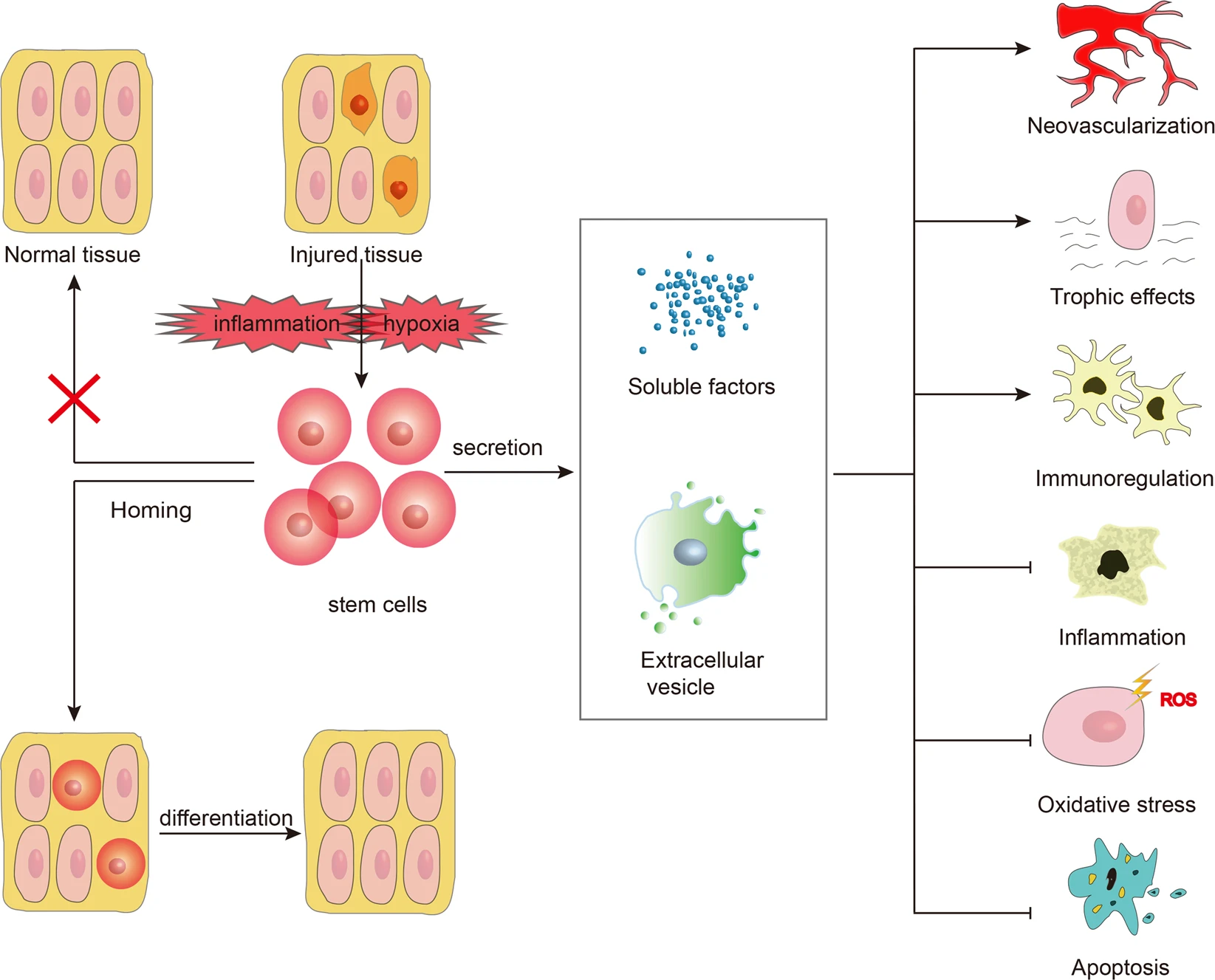 另一種是營養效應(圖1)。 干細胞通過促進旁分泌、內分泌或自分泌機制發揮作用,例如有絲分裂、新血管形成、抗炎、細胞保護、抗生產和免疫調節。