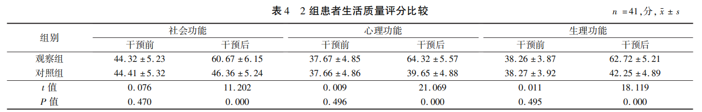 2組患者生活質量評分比較:干預前,2組患者生理功能、社會功能、心理功能得分差異無統計學意義 (P>0.05)。 干預后,觀察組生理功能、社會功能、心理功能得分高于對照組(P<0.05)。見表4。