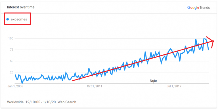 目前已發表了至少26,805 篇有關外泌體的科學文章,并且正在進行301項臨床試驗,這些小囊泡在一系列治療應用中具有令人著迷的潛力。過去10年,“外泌體”一詞已成為Google上越來越常見的搜索詞,如下圖所示: