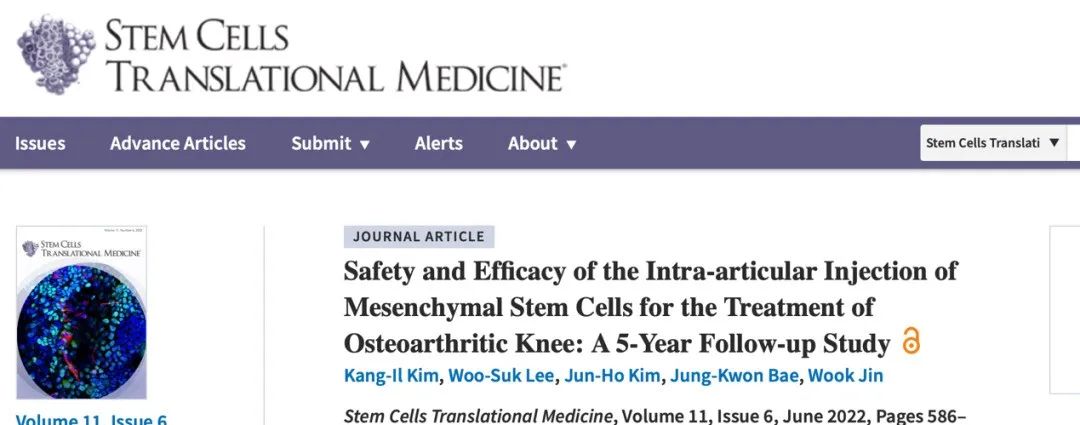 2022年7月,韓國首爾江東慶熙大學(xué)醫(yī)院發(fā)表在《Stems Cells Translational Medcine》的5年隨訪研究證實,通過向關(guān)節(jié)腔內(nèi)注射間充質(zhì)干細(xì)胞可安全有效治療膝關(guān)節(jié)骨性關(guān)節(jié)炎。研究結(jié)果發(fā)現(xiàn),經(jīng)過間充質(zhì)干細(xì)胞治療的膝骨關(guān)節(jié)炎患者在注射后6個月直至隨訪結(jié)束時,膝骨關(guān)節(jié)疼痛程度更輕且膝骨關(guān)節(jié)功能狀態(tài)更好。