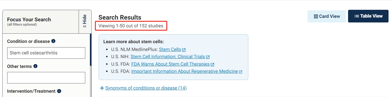 截至2023年10月26日,在美國國立衛(wèi)生研究院的最大臨床試驗注冊庫http://clinicaltrials.gov網(wǎng)站上注冊的有關(guān)干細(xì)胞治療骨關(guān)節(jié)炎的臨床研究項目達(dá)到了152余項,其中一部分已經(jīng)完成了臨床試驗,以及安全性和有效性的初步評價。東亞、西歐、中東和美國是干細(xì)胞臨床治療研究的主要地區(qū)。