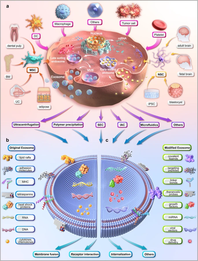 目前,外泌體主要根據其親代細胞的類型進行分類。幾乎所有類型的人類細胞都可以產生外泌體。這些包括但不限于巨噬細胞、樹突細胞(DC)、血小板、干細胞、甚至腫瘤細胞 (圖1a)。