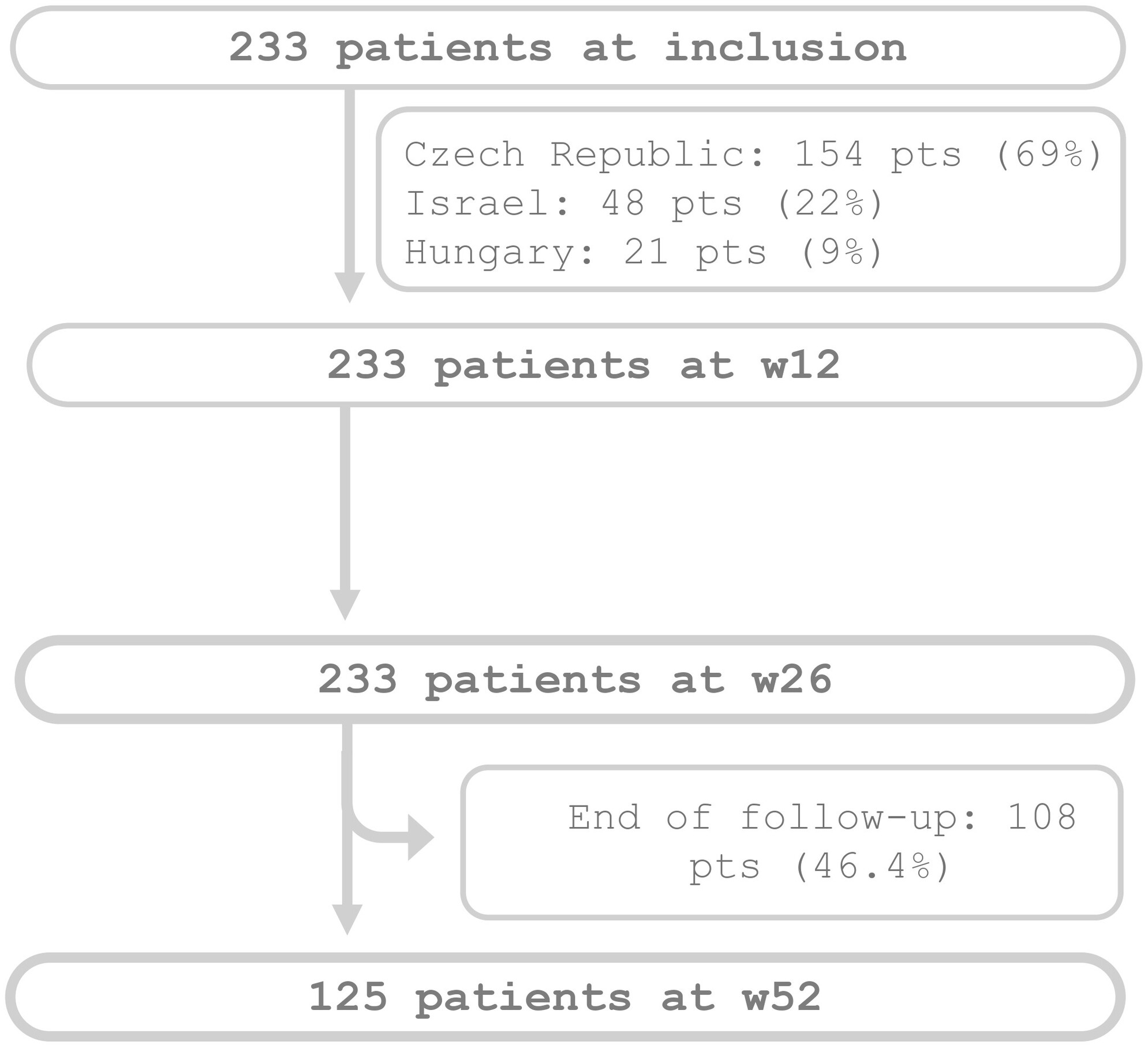 患者特征:總體而言,我們分析了223名CD患者(男女比例:0.48)的數據,中位隨訪時間為(51.9周)。在這些患者中,69%(154/223)、22%(48/223)和9%(21/223)分別來自捷克共和國、以色列和匈牙利。