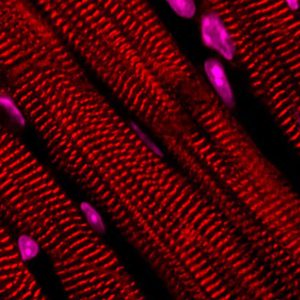 小鼠心臟的特寫鏡頭,染色顯示有助于心肌細胞收縮的重要結構蛋白(紅色)。